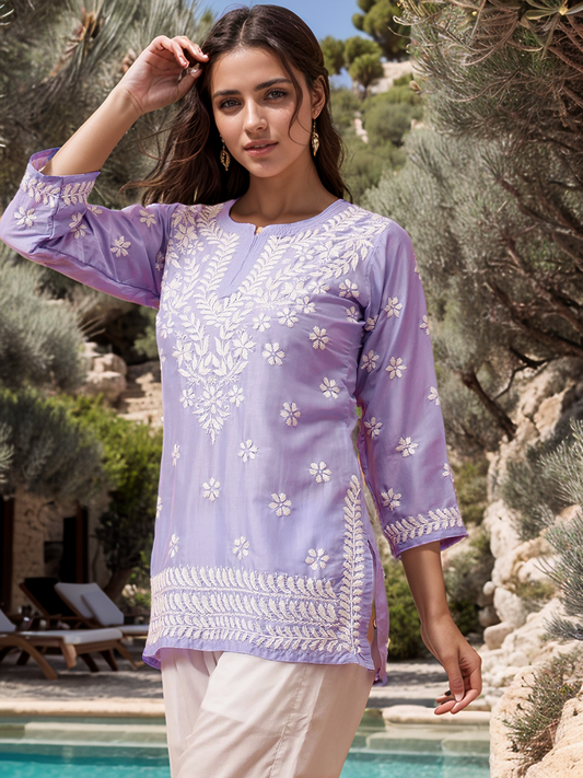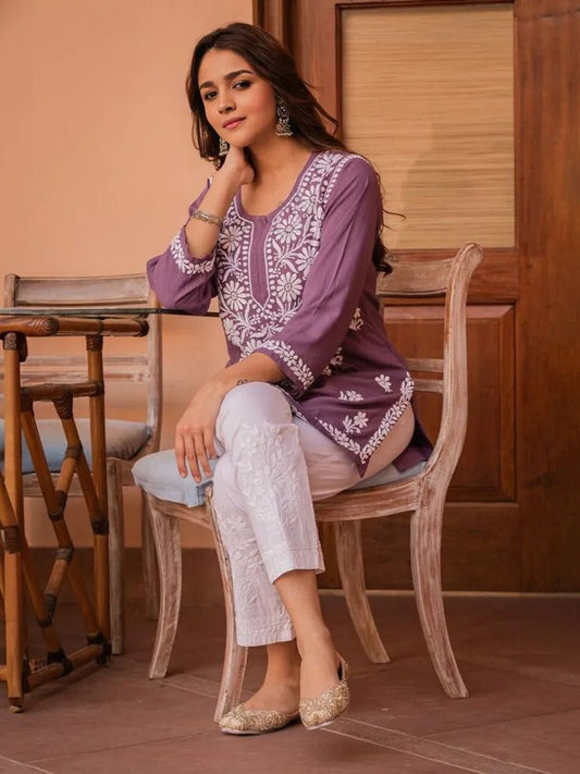 Purple Solid Round Neck Chikankari Pure Cotton Straight Kurti