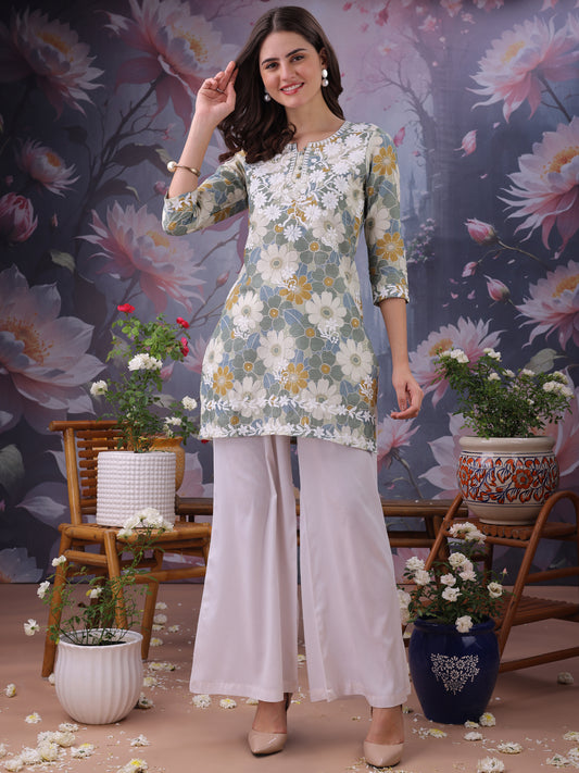 Floral Printed Notch Neck Chikankari Pure Cotton Straight Kurti