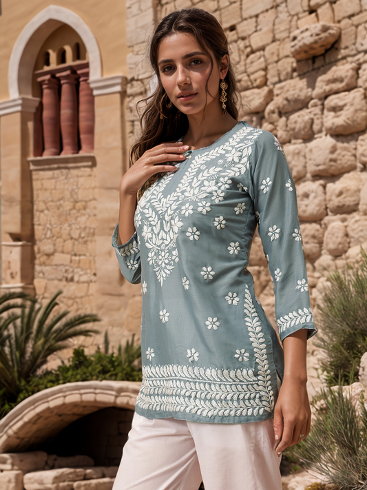 Grey Solid Round Neck Chikankari Pure Cotton Straight Kurti