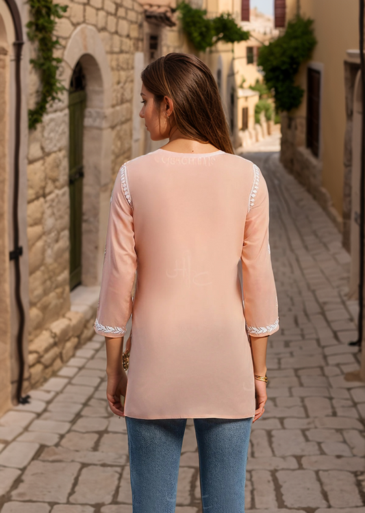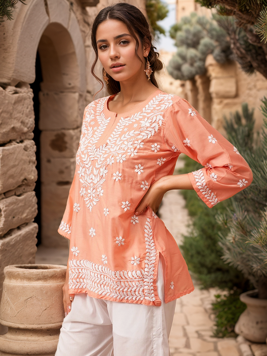 Peach Solid Round Neck Chikankari Pure Cotton Straight Kurti