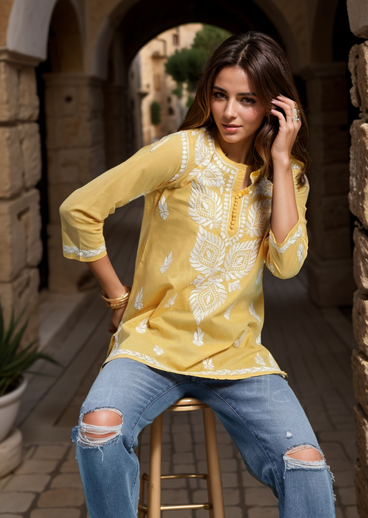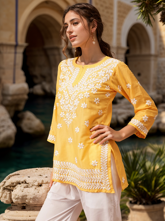 Yellow Solid Round Neck Chikankari Pure Cotton Straight Kurti