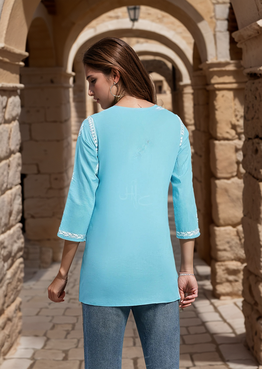 Firozi Solid Round Neck Chikankari Pure Cotton Straight Kurti