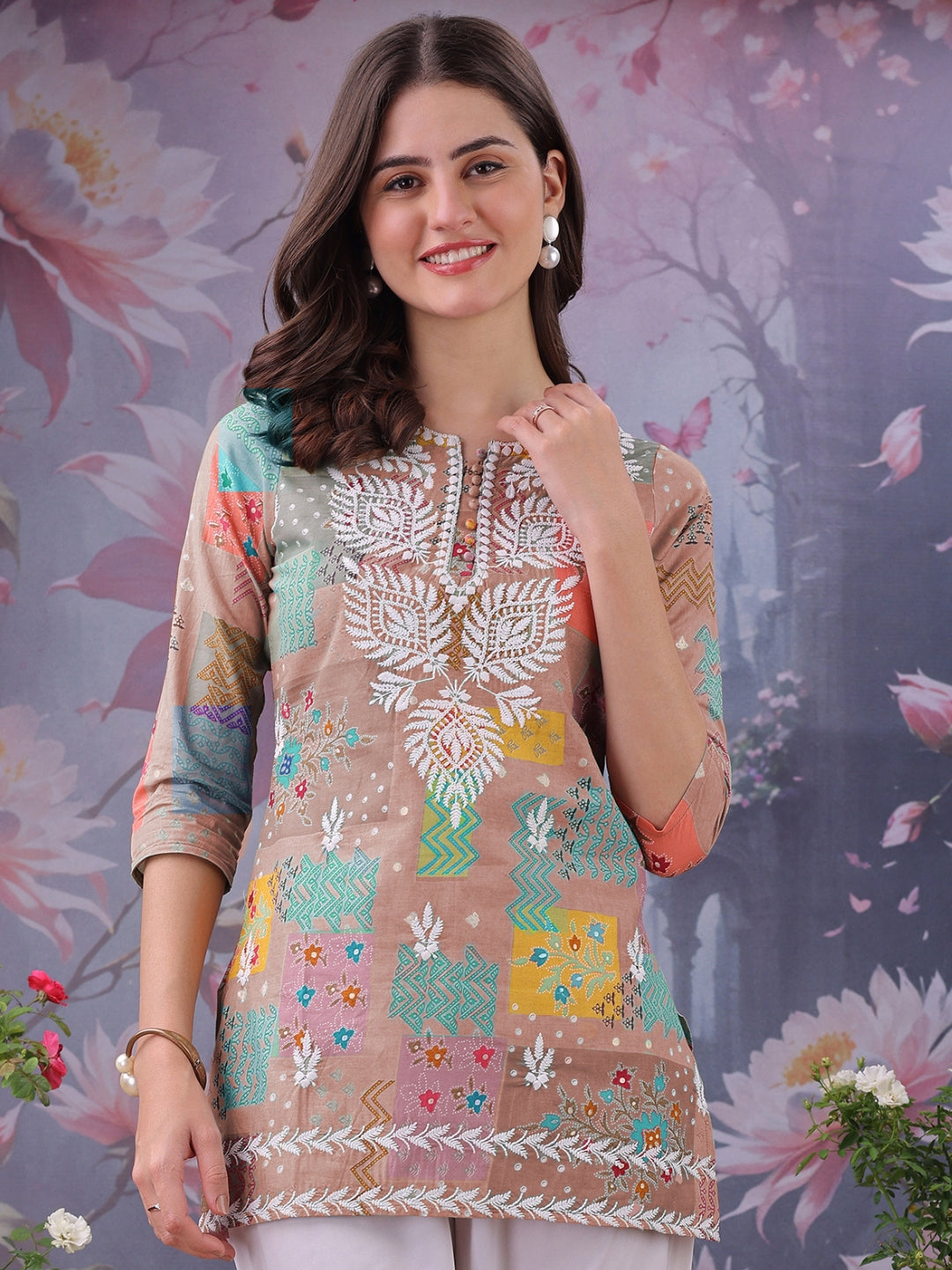 Peach Printed Notch Neck Chikankari Pure Cotton Straight Kurti