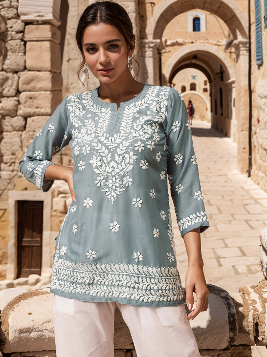 Grey Solid Round Neck Chikankari Pure Cotton Straight Kurti