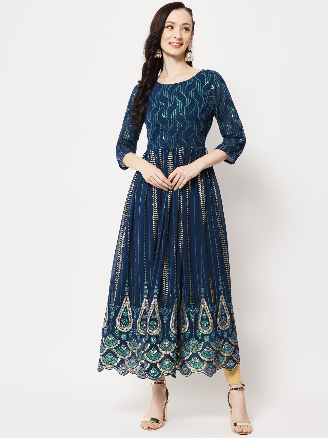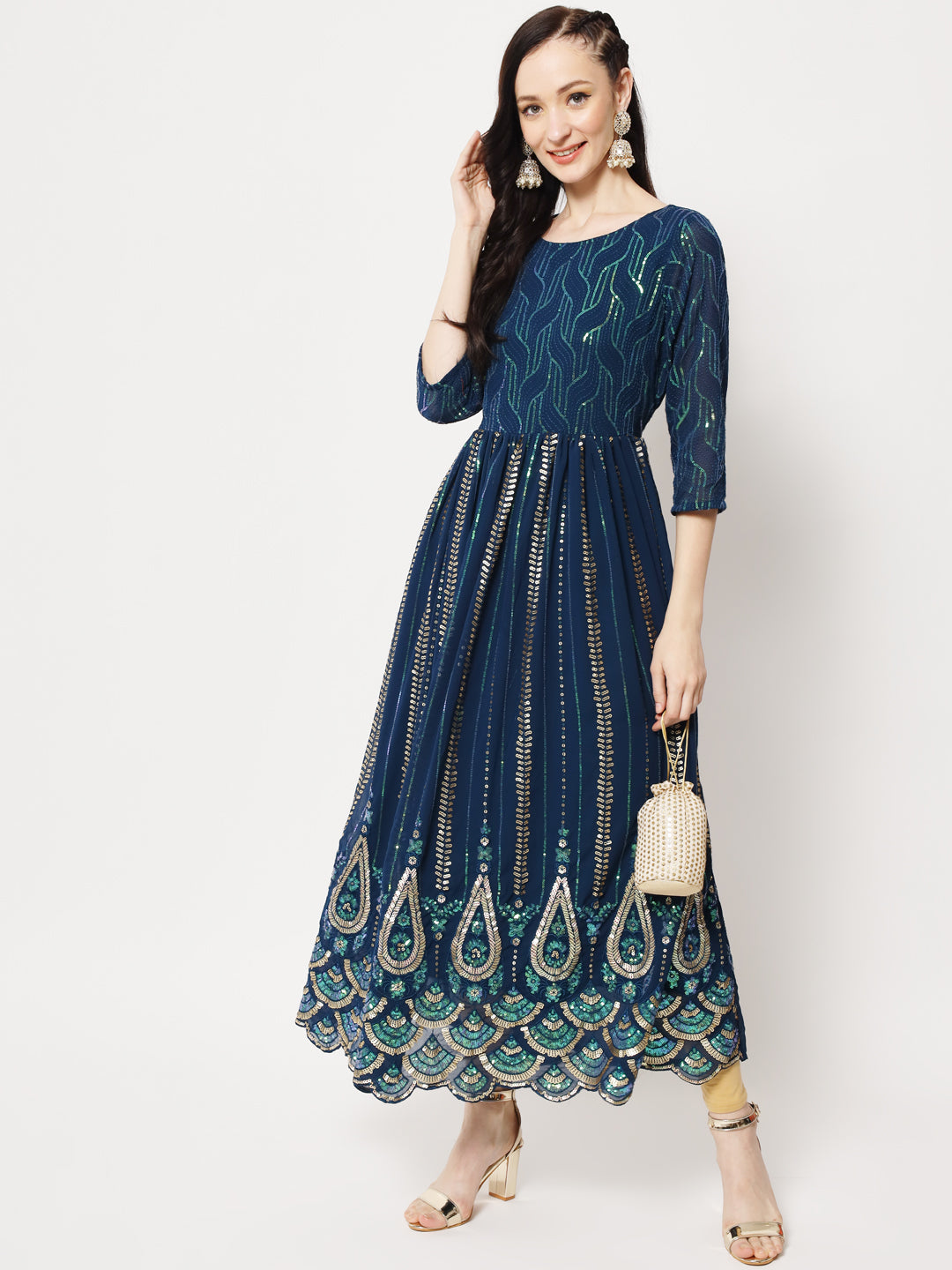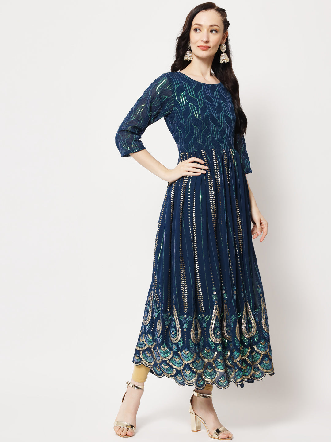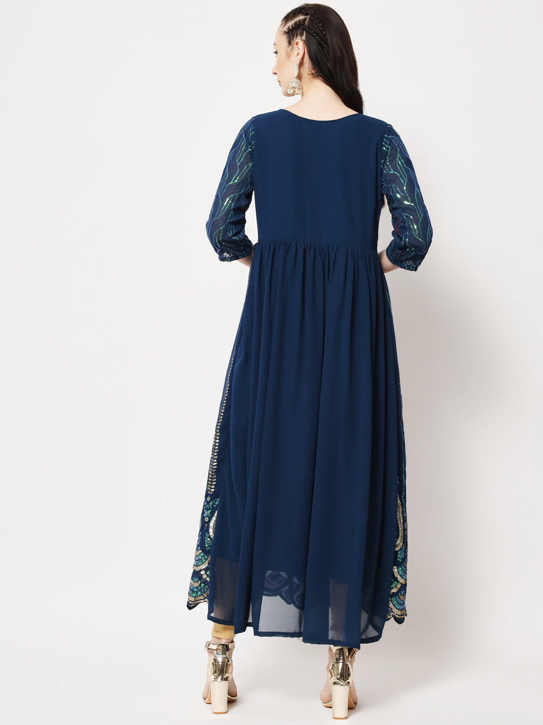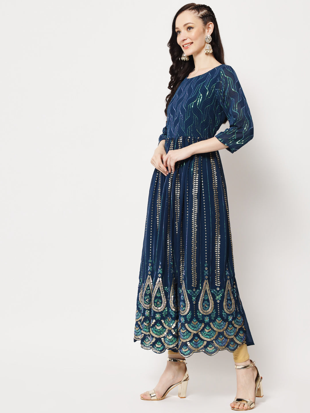 Teal Sequin Embellished Anarkali Gown in Georgette Fabric